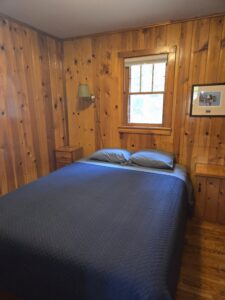 Pine Haven Cottage has two bedrooms with a queen bed in each. The cottage includes heat and air conditioning with a view of the bay.