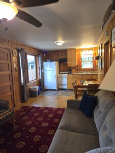 THE RESORT offers six lakeside cottages from rustic to modern—with one or two bedrooms. Each cottage is lakeside with its own lakeview and dock which provide a Northwoods experience. All have a full kitchen and living room area and a bath with toilet, sink and shower. The two-bedroom cottages have an enclosed porch to enjoy the outdoors, while still inside. Well-behaved dogs are allowed to be guests in the cottages for an extra charge.